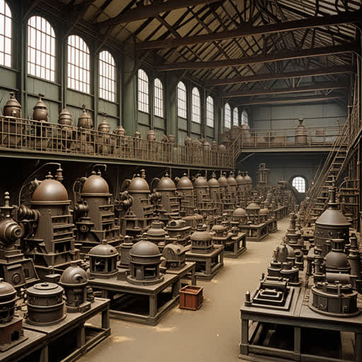 تخيل مكانًا مليئًا بالحرارة الشديدة واللهب، حيث يرتدي العمال أقنعة واقية ويقومون بصب المعدن المنصهر في قوالب كبيرة. المنظر العام يشبه مصنعًا ضخمًا ينتج قطعًا معدنية معقدة.