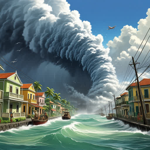 On a remote tropical island, the inhabitants were accustomed to peace and tranquility. But one day, the sky began to change. The weather forecast announced the arrival of a 'hurricane'. The winds blew with unprecedented force, and the rain poured down heavily. Shops and homes were closed, and people gathered in safe shelters. The 'hurricane' lasted for many hours, leaving behind chaos and destruction. But thanks to their preparation, everyone survived. After the hurricane passed, everyone worked together to rebuild what the 'hurricane' had destroyed, emphasizing the strength of the community in facing difficult circumstances.