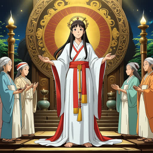 In the heart of an ancient forest, where tall trees danced in the wind, lived a 'priestess' named Elara. Elara was a wise and powerful woman, wearing a purple robe and adorning her hair with exotic flowers. She was the link between her people and the ancient gods. Every morning, she would go to her light-drenched temple, offer prayers, and interpret visions. One day, a scared little child came to the temple, reporting a dragon threatening their village. The 'priestess' Elara looked at him with wise eyes, took her hand-carved staff, and set off to confront the dragon, believing in the power of the gods she served.