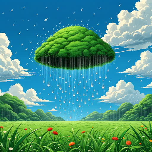 On a hot summer day, when the earth was thirsty, dark clouds gathered in the sky. Suddenly, a tiny 'raindrop' fell on a glass window. It was followed by another, and then another, and soon the rain began to pour heavily. Each small 'raindrop' carried hope for the fields and trees, watering the parched soil and washing the plant leaves. They danced as they fell, and every 'raindrop' that touched the ground made a refreshing sound, rejuvenating nature and bringing it back to life.
